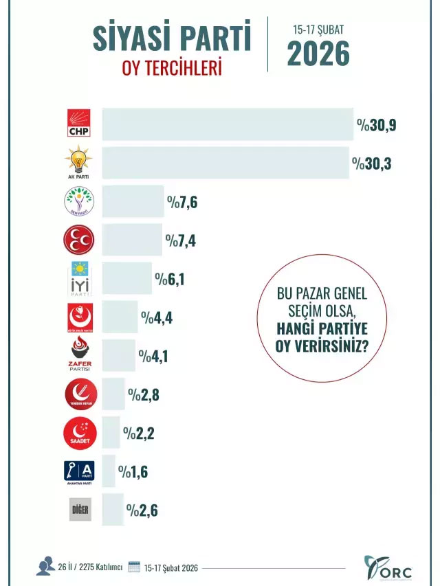 ORC Araştırma, 15-17 Şubat 2026 tarihleri arasında 26 ilde 2 bin 275 kişiyle yaptığı siyasi eğilim araştırmasının sonuçlarını kamuoyuyla paylaştı. Katılımcılara, “Bu pazar genel seçim olsa hangi partiye oy verirsiniz?” sorusu yöneltildi.